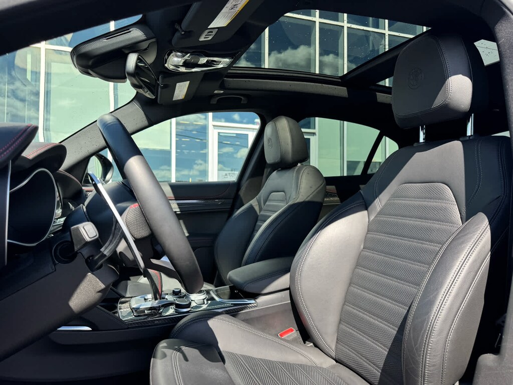 Blind Spot Monitor, Cross-Traffic Alert, Child Safety Locks, Electronic Stability Control, Brake Assist, 4-Wheel ABS, 4-Wheel Disc Brakes Alfa Romeo Estrema with Vulcano Black Metallic exterior and Black interior features a 4 Cylinder Engine with 280 HP at 5200 RPM*. AutoCheck One Owner Excellent Condition